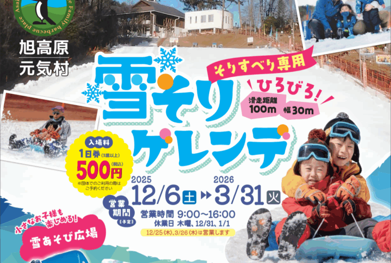 旭地区の冬の観光スポット、旭高原元気村の「雪そりゲレンデ」が、いよいよ12月6日(土)よりの営業を開始いたします。